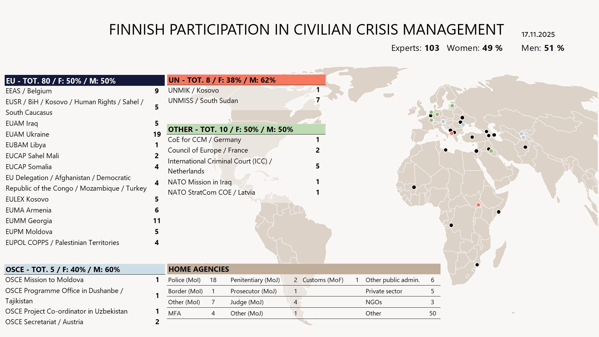 Civilian crisis management experts deployed by CMC Finland serve in civilian crisis management missions and operations, and related international assignments in the context of UN, EU Common Security and Defence Policy (CSDP), OSCE, and a number of other International Organisations. By zooming the map closer, you will see all the operations, missions and secretariats in the same country.