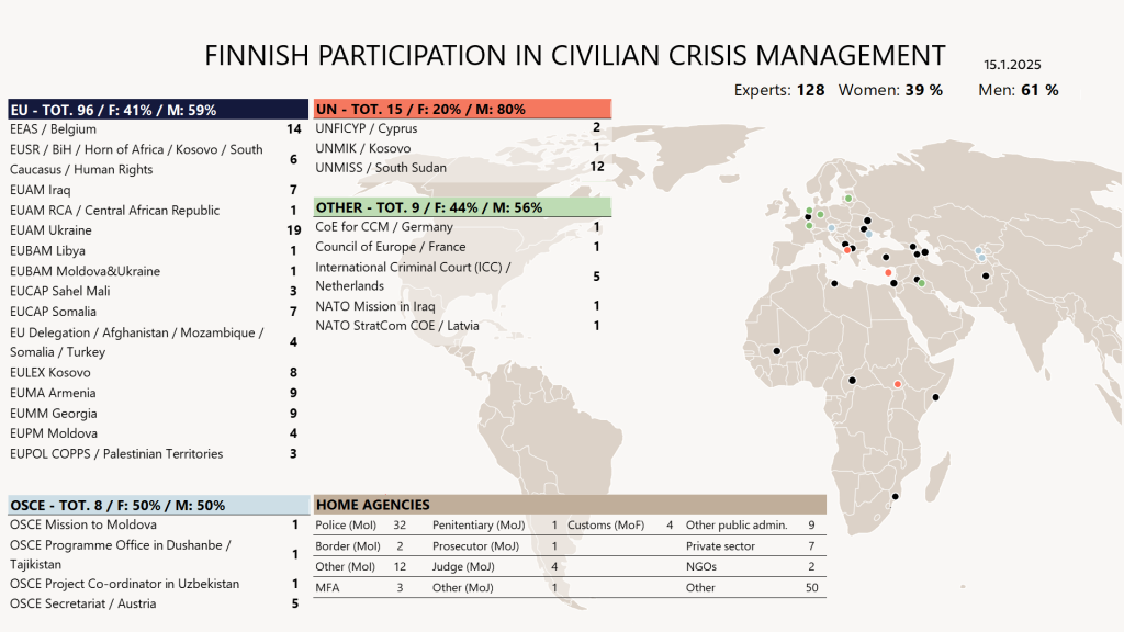 Currently 128 Finnish experts work in international assignments in civilian crisis management missions or secretariats. 39 % of them are women. 96 experts serve in the assignments of the EU, 15 in the UN and eight in the OSCE. Nine experts work in other organizations.