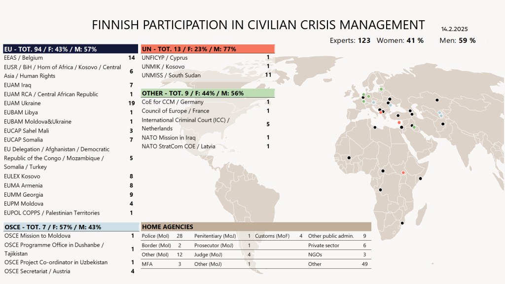 Currently 123 Finnish experts work in international assignments in civilian crisis management missions or secretariats. 41 % of them are women. 94 experts serve in the assignments of the EU, 13 in the UN and seven in the OSCE. Nine experts work in other organizations.