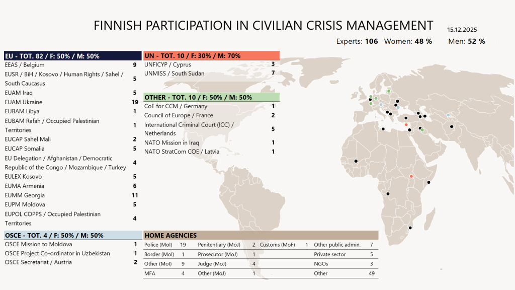 Currently 106 Finnish experts work in international assignments in civilian crisis management missions or secretariats. 48 % of them are women. 82 experts serve in the assignments of the EU, ten in the UN and four in the OSCE. Ten experts work in other organisations.