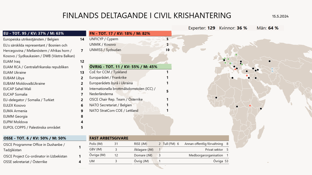 För närvarande tjänstgör 129 finländska experter i internationella civil krishanteringsuppdrag och i internationella organisationernas sekretariat. 36 % av dem är kvinnor. 95 experter tjänstgör i EU, 17 i FN och sex i OSSE. 11 experter arbetar i övriga organisationer.