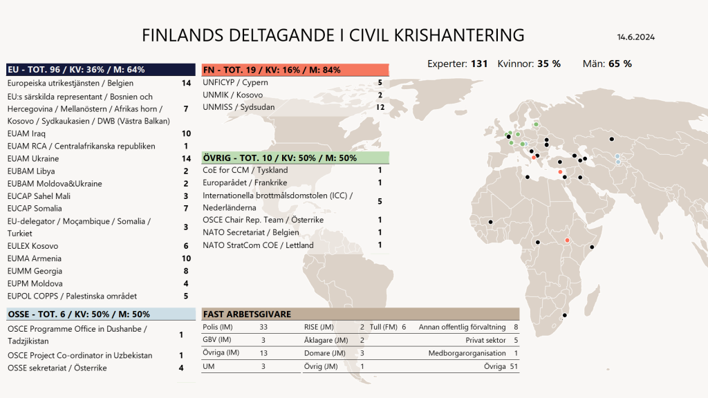 För närvarande tjänstgör 131 finländska experter i internationella civil krishanteringsuppdrag och i internationella organisationernas sekretariat. 35 % av dem är kvinnor. 96 experter tjänstgör i EU, 19 i FN och sex i OSSE. 10 experter arbetar i övriga organisationer.
